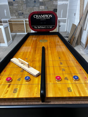 The Bank Shot Shuffleboard Table brings Champion’s world-class quality to spaces where a full-size table won’t fit. Handcrafted with the same attention to detail as Champion’s larger models, the Bank Shot introduces a fresh twist on shuffleboard with its bumper-style playfield and handicap scoring system. Compact yet versatile, it transforms any game room into a hub of competition, laughter, and fun—proving that shuffleboard excitement comes in all sizes.