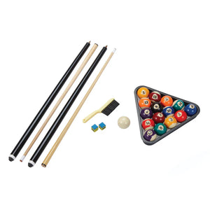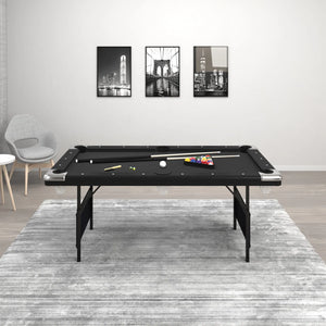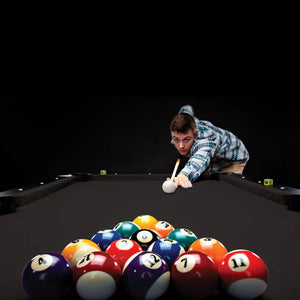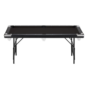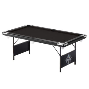 The Fat Cat Trueshot Foldable Billiard table is designed with two concepts in mind: convenience and fun. The folding leg design allows for incredibly easy set up. Simply unfold the legs, insert four screws to lock them in place, and youโre ready to play. There are also built-in leg levelers so you can set it up anywhere. This 6โ folding billiard table will fit in most spaces and the legs fold up easily so you can reclaim your room for get-togethers. The base of the Trueshotโs rails are thicker, giving your table added support. The K-818 rubber bumpers ensure you get consistent bounces on every shot. The Trueshot pool table comes with everything you need to start playing: two 57โ billiard cues, a triangle, a set of 2.25โ billiard balls, and a table brush.
