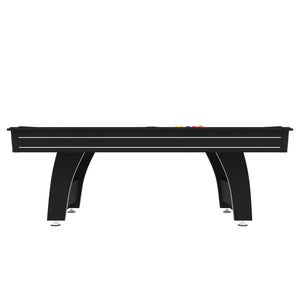 About the table: The finish and construction are designed to evoke the feel of modern pool centers. It includes a 3/4" high-quality MDF playing surface, rubber bumpers, and curved pedestal-style legs with leg levelers to keep your table stable (even on uneven floors). This table measures 84" long, 46.5" wide, and 31" high, while the playfield measures 75" long by 37.5" wide.