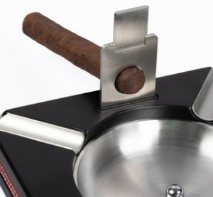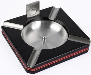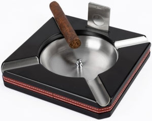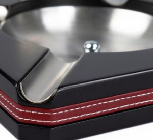 Elevate your cigar lounge setup with this 4-cigar ashtray featuring a matte black wood finish, burgundy red leather trim, and polished silver accents. Designed for both style and convenience, this ashtray comes with a built-in upright guillotine cigar cutter so you can cut and enjoy your cigars in one place.