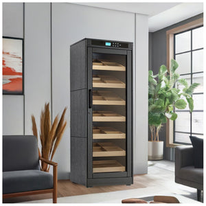 Crafted with cedar-lined trays and shelves, this cabinet combines functionality with elegance. The sleek touchscreen digital control panel offers effortless management, allowing you to toggle between Fahrenheit and Celsius and adjust temperature (41°F-71°F) and humidity (56%-78%) settings to protect your prized collection.
