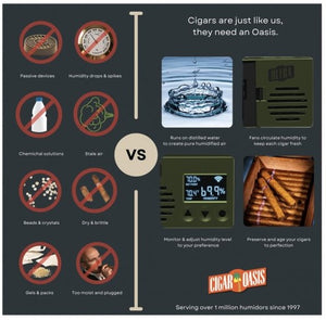 Ideal for humidors storing up to 100 cigars or 1.5 cubic feet, this upgraded model features a sleek digital display, soft-touch controls, and built-in Wi-Fi Smart Humidor technology for remote monitoring and control via smartphone or desktop (subscription required). Receive email and text alerts when humidity or water levels are low, ensuring your cigars remain perfectly protected at all times.