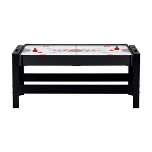 All of the most popular games are now at your disposal, in a third of the space with the Fat Cat 3-in-1 Flip Game Table! This revolutionary multi-game table design offers an unprecedented three of the most popular game room games that would normally take up the space of three separate tables in a single unit! Your family will be in for hours of fun flipping between the different games the Flip Table has to offer! Each table surface is optimized for its game, ensuring a great experience no what game you play. The first game to mention is pool, the Flip Table features a smooth durable playing surface that plays just like a pro table. With a sleek built-in pocket design, the table is totally contained. The space-saving playing field is surrounded by real rubber bumpers for an authentic bounce and covered in heavy duty cloth. On the flip side of the billiard table is the air powered hockey table. Where other tables feature motorless หœslide hockey,โ€™ the Pockey Table features a full-powered 110 volt electric motor. The extra glossy playing surface features hockey rink graphics for an excellent atmosphere during games. Easily keep track of the score with a manual scorer. The last game featured is a convenient table tennis top that can be used on either side. Changing between game modes is a snap with the exclusive latch system that locks the table into place for a stable game. The reversible table top is housed in a versatile frame complete with storage for the plethora of accessories included in this all-in-one package. Speaking of accessories, the Pockey Table includes: four pushers and pucks, a set of 1.5โ€ billiard balls, a resin triangle, two 57โ€ cue sticks, two pieces of chalk, a billiard brush, two table tennis paddles and balls, and a net with post set.