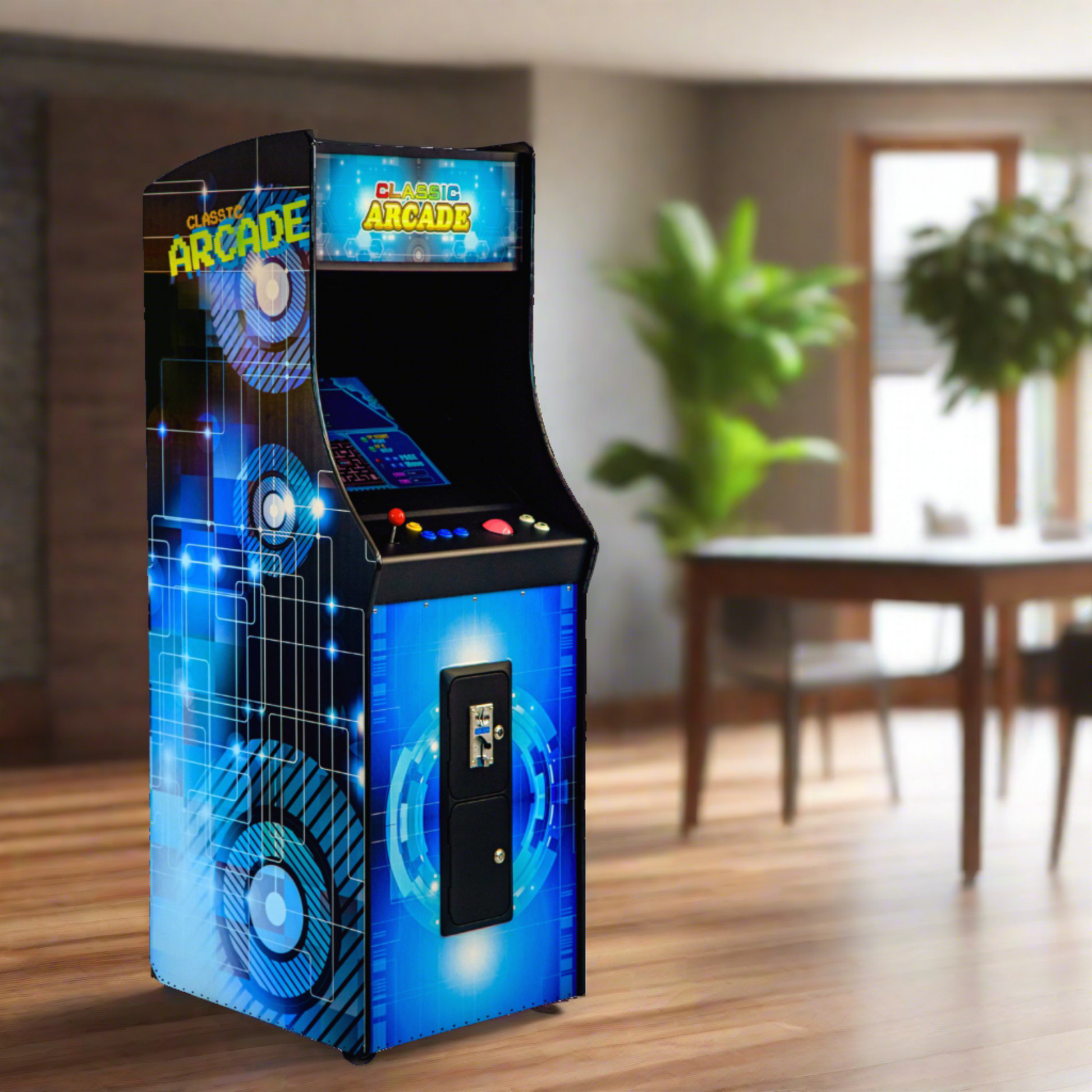 Your machine is set to Free Play by default, making it ideal for home use, while the fully functioning coin-op system gives you the flexibility to create a more traditional arcade experience if desired. An integrated amplified sound system with bass, treble, and mute controls lets you customize the sound to fit your space and playing style.