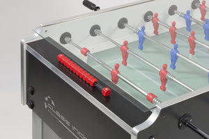 The first home/non-coin operated Garlando foosball table with top glass. The balls remain inside the playfield area and cannot be lost or stolen. They are conveyed into the playfield by an external device and stay inside all game long. Matches are quieter as the glass softens the game noises, and the playfield stays cleaner longer.