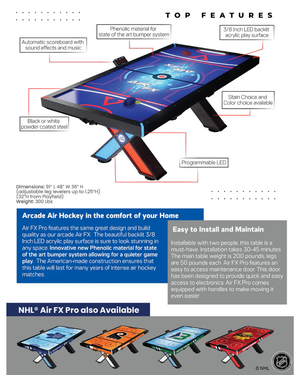 Installable with two people, this table is a must-have. Air FX Pro, our newest addition to the Home Pro line, is designed after the #1 arcade air hockey — the commercial-grade ICE Air FX air hockey table. Installation takes 30-45 minutes. The main table weight is 200 pounds; legs are 50 pounds each.