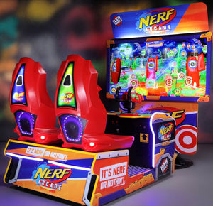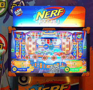 Step into high-energy arcade action with Nerf Arcade, an exciting shooter game developed by Raw Thrills in partnership with Hasbro. Featuring oversized vibrant graphics, LED lighting, and iconic Nerf blaster guns, this family-friendly arcade machine delivers fast-paced, skill-based fun across four immersive scenes.